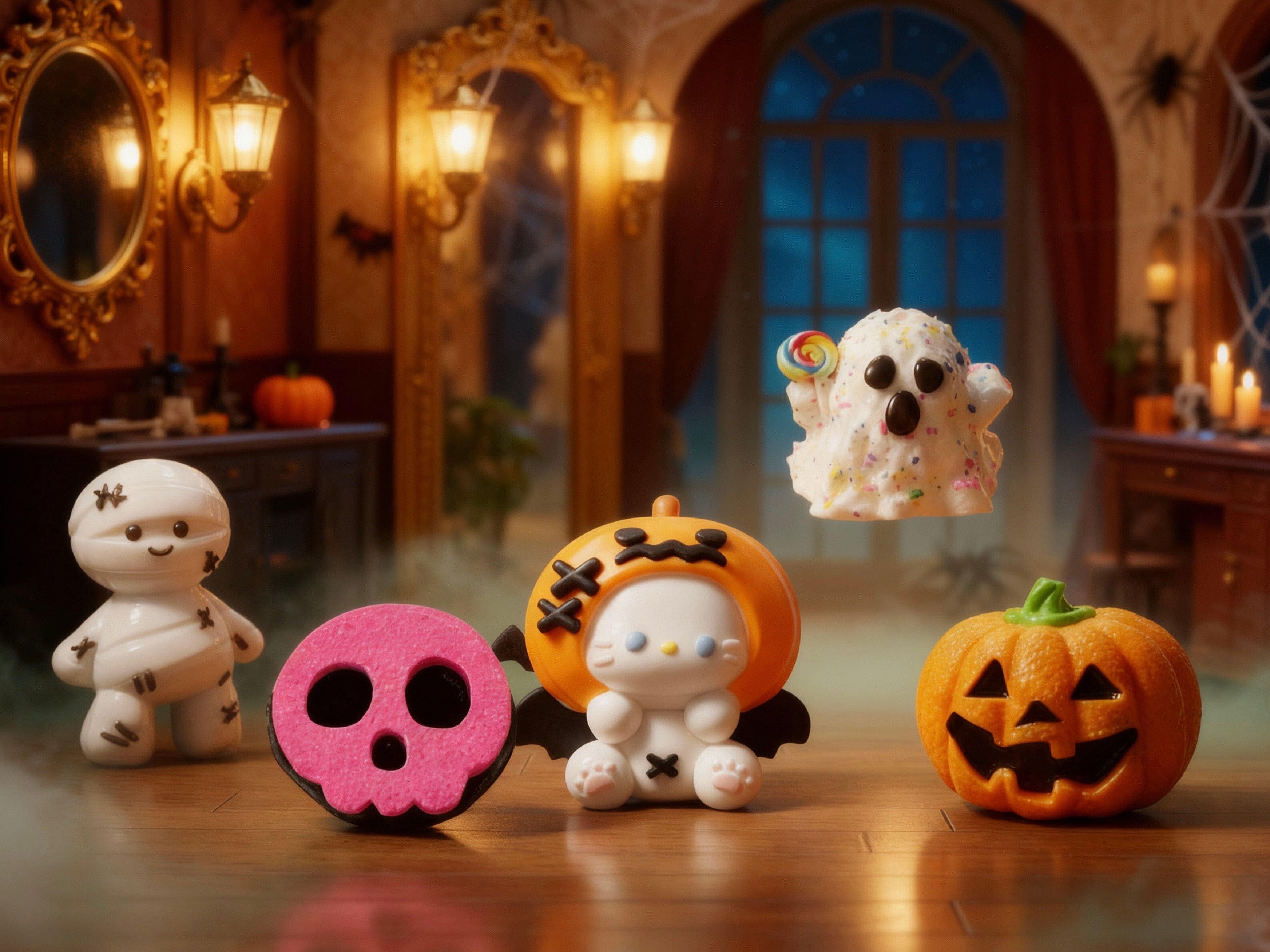 👻 Mummies sneak out, pumpkins glow, skeletons rattle, candy ghosts swirl—and a cheeky pumpkin-headed kitty leads the Halloween parade! 🎃